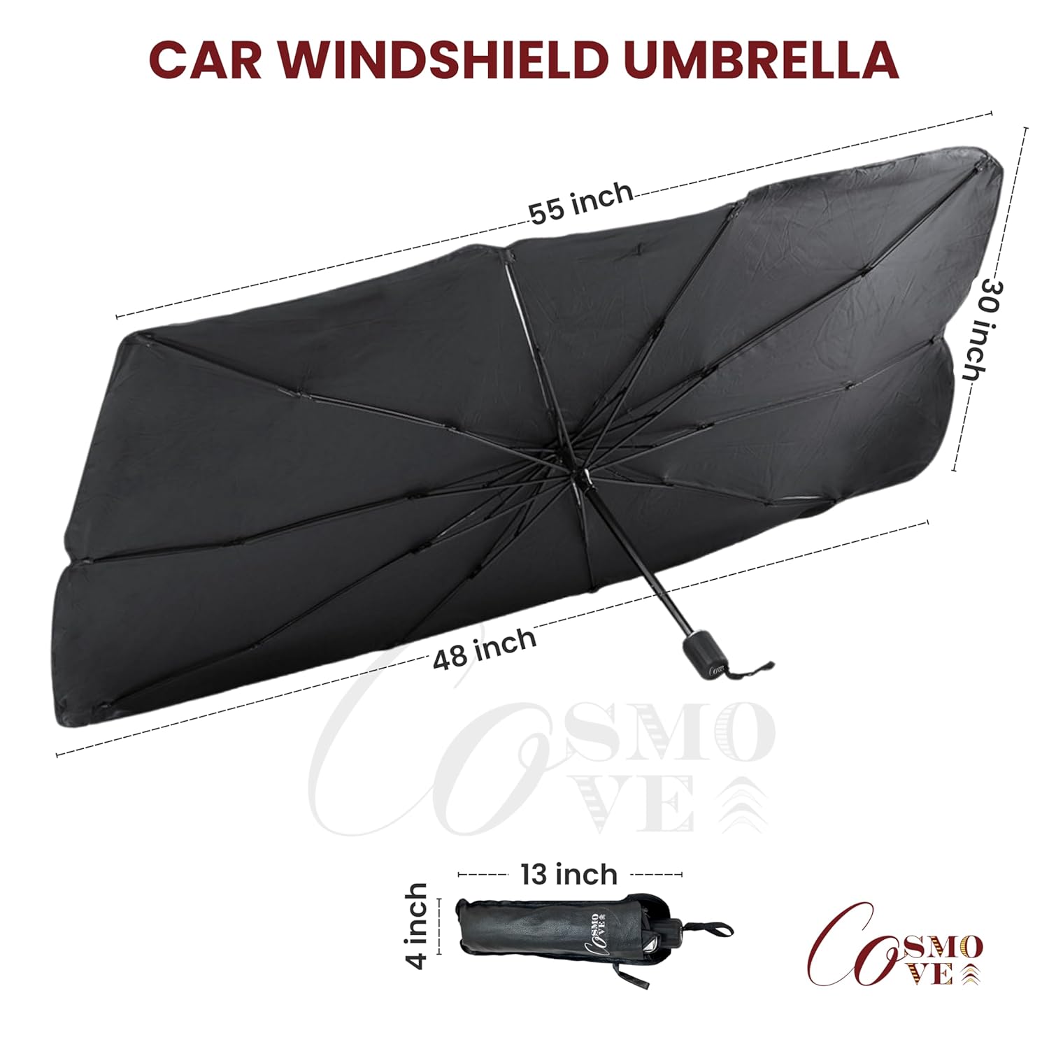 - [Foldable Car Umbrella for Quick & Easy Use] The car umbrella is easy to set up and fold away, offering instant relief. Perfect as a car windshield umbrella, it provides essential coverage against the sun's rays and helps keep your interior cool and protected.